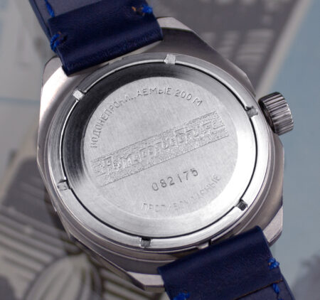 Gravure sur le fond : Амфибия, водонепроницаemыe 200M (étanche à 200 mètres), противоударные (antichoc), Aвтоподзавод (remontage automatique) et n°182175