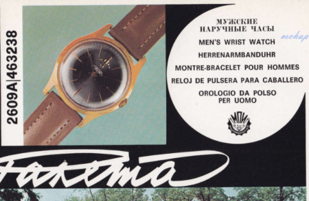 Mentions sur le calibre : N° de série (57497) sur la platine, logo de Raketa (la raquette symbolisée), 2609. Et 16 камней (16 rubis) sur le pont