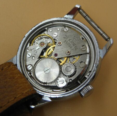 Mentions sur le calibre : N° de série (57497) sur la platine, logo de Raketa (la raquette symbolisée), 2609A. Et 21 камней (21 rubis) sur le pont