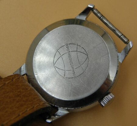 Gravure sur le fond : Globe terrestre avec en guise d’équateur la mention противоударные (antichoc).