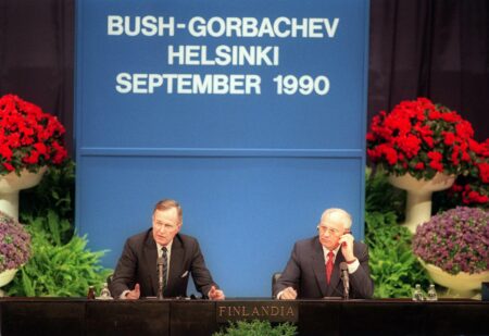 Le 9 septembre 1990, une rencontre bilatérale privée entre Gorbatchev et le président américain George H. W. Bush se tient à Helsinki, en Finlande. La résolution de la crise du Golfe, l’invasion du Koweït par l’Irak en août 1990 a été le principal sujet de discussion.