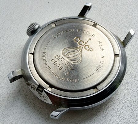 Gravure sur le fond : Le logo à trois coupoles de l’export vers l’occident, Сделано в СССР Made in USSR BOCTOK водонепроницаemye (étanche) et 003615
