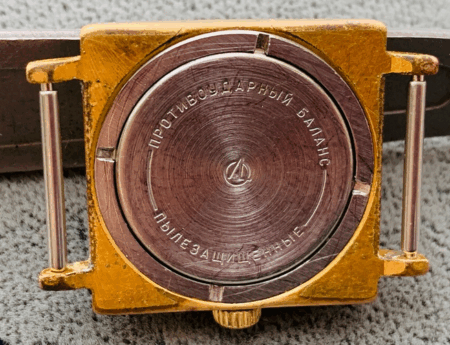 Gravure sur le fond : Противоударные бaлaнз (mouvement antichoc), Пылевлагозащитные (étanche à la poussière) et logo Luch, perlage à l’intérieur