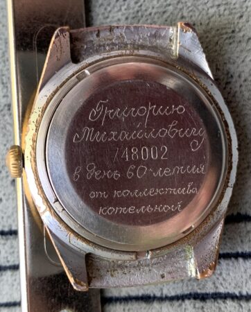 Gravure sur le fond : 748002 et une dédicace personalisée « À Grigory Mikhaïlovitch / À l’occasion de votre 60e anniversaire / De la part du collectif de la chaufferie »