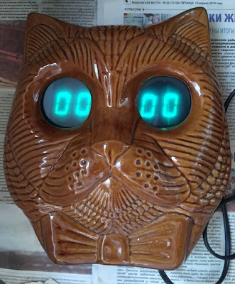 Cette horloge digitale à affichage en tubes a un boîtier en céramique émaillée représente un élégant chat gentleman avec un nœud papillon, très certainement Léopold le chat. Elle a été produite par le combinat Hadron de Novossibirsk sous la marque Elektronika 01. Elle est équipée de microcircuit spécial KR145IK1901, offrant une précision supérieure à celle des montres à quartz. Le prix de l’horloge « Chat » était de 40 roubles, (celui du modèle « Hiboux » était de 34 roubles).