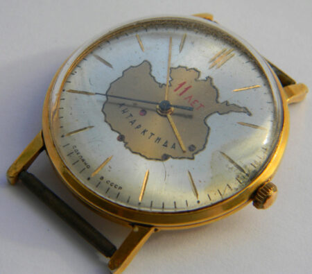 Ces montres de la 1ère Fabrique de Montres de Moscou ont été produite en petit série à l’occasion des 10e et 11e expédition antarctique soviétique ou plutôt pour les 10e et 11e anniversaire des expéditions. Le cadran, avec la mention « 10 АНТАРКТИДА » (« 10 Antarctique », dont 1966) et « 11 лет АНТАРКТИДА » («11 ans Antarctique », donc 1967), représente le continent antarctique avec, en rubis, les quatres bases soviétiques alors en activités : Vostok, Novolazarevskaya, Mirny, Molodezhnaya. Ces montres étaient probablement réservées aux membres des expéditions. C’est le boitier plaqué or des Вымпел (Vimpel, « Pennant »). Elles emboîtaient un mécanisme : 2209