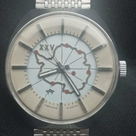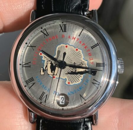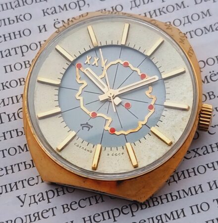 Prototype expérimental pré-série, n’ayant pas été produit en masse. C’est le seul exemplaire connu de cette montre avec la mention « Путешествие в Антарктику / Voyage to Antarctika » avec carte de l’Antarctique (avec des points rouges pour les bases antarctiques soviétiques). Mécanisme 2614H