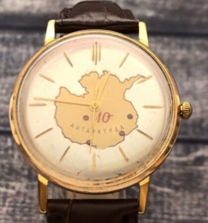 Sur une base de Raketa « marine », un cadran avec la carte de l’antarctique avec les bases et la mention « Советская антарктическая экспедиция » (« Expédition antarctique soviétique »).