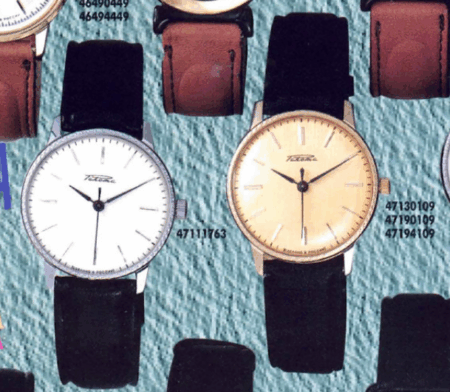 Au catalogue Raketa 1992 (le boîtier chromé à gauche, le cadran à effet de tissus à droite) :