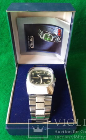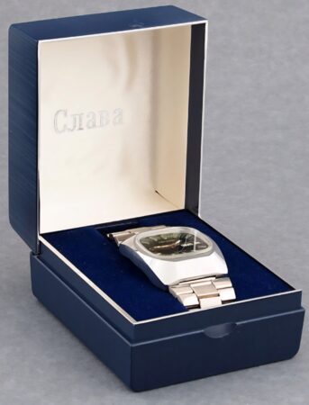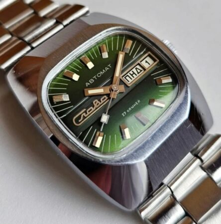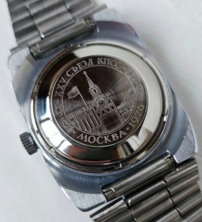 Slava automatique avec calendrier jour et date, pour l’exportation, de la 2e Fabrique de Montres de Moscou. Cette Slava a un fond gravé dédié au 25e Congrès du PCUS qui s’est déroulé à Moscou du 24 février au 5 mars 1976.