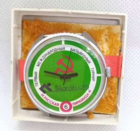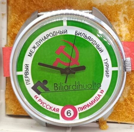 Pas de marque, mais il s’agit d’une Raketa célébrant premier et unique tournoi international de billard russe en URSS.