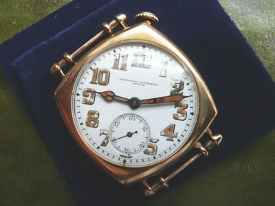 Le pionnier est Vacheron Constantin qui, en 1919, a fabriqué une montre au boîtier coussin avec une couronne placée dans le coin supérieur gauche, à 11 heures. En raison de la position de la couronne et de l’utilisation d’un mouvement conventionnel de montre de poche, le cadran est légèrement tourné, de sorte que la couronne se trouve à 12 heures, dans le coin supérieur gauche. Portée au poignet droit, la montre permettait de lire l’heure tout en gardant les mains sur le volant.
