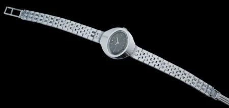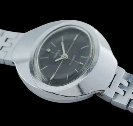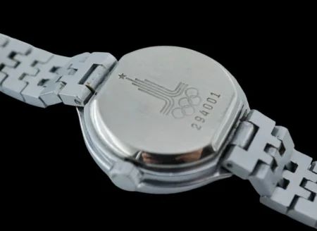 Montre pour dame, mécanique, avec bracelet intégré, produite par la Fabrique de Montres « Tchaïka » d’Ouglitch célébrant les Jeux olympiques de Moscou de 1980 avec le logo des Jeux. sur le fond du boîtier