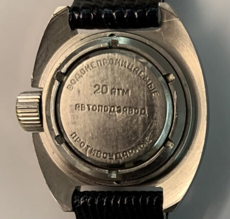 Gravure sur le fond : Bодонепроницаемые (étanche), Противоударный (antichoc), Aвтоподзавод (mécanisme automatique), 20 Атм (20 atmosphères)