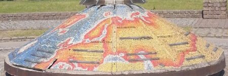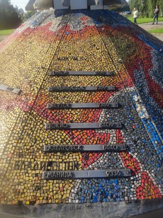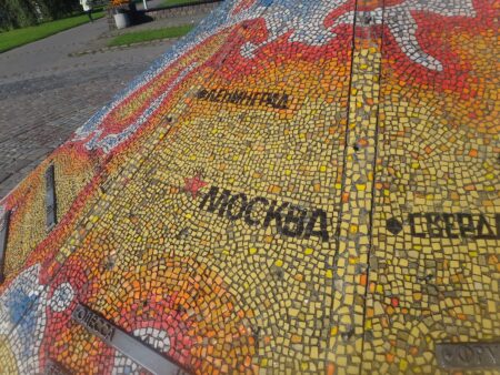 A son pied se trouve une carte du monde en mosaïque. Des plaques indiquent la distance entre des grandes villes et Kaliningrad.
