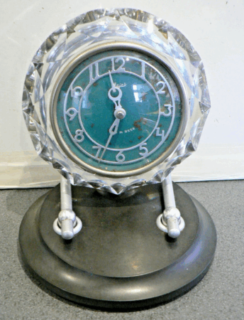 L’horloge est sur deux tiges fixées sur une socle de bakélite noire.