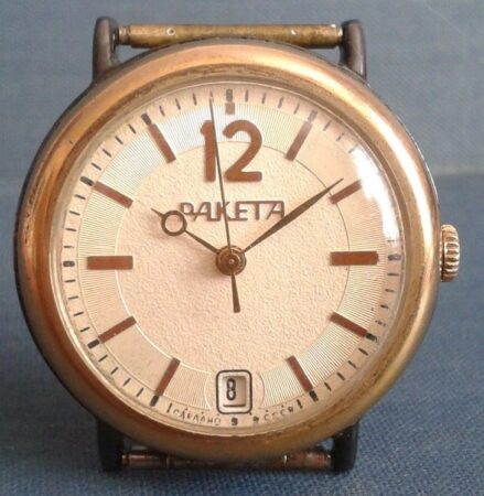 Mentions sur le calibre : 2614.H et SU (Soviet Union) sur le pont, logo raketa (raquette symbolisée) sur la platine.