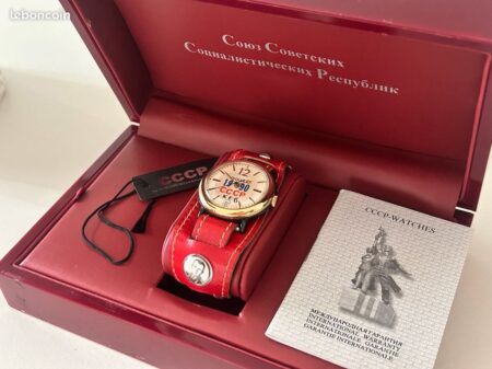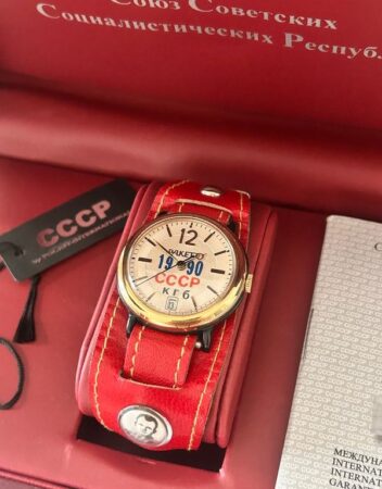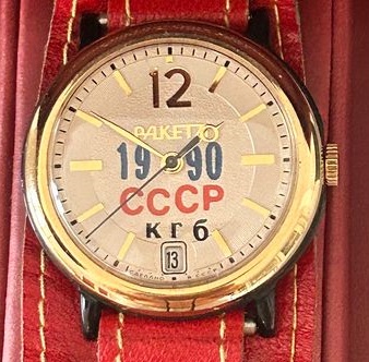 Modèle d’exportation avec packaging CCCP, avec bracelet bund « Gagarine » (voir ici) et marquage « 1990 CCCP KGB » (rien que ça…)