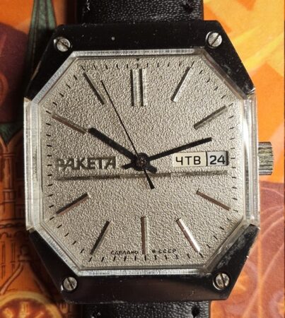 Mentions sur le calibre : 2628.H, SU (Soviet Union) sur le pont et logo Raketa sur la platine