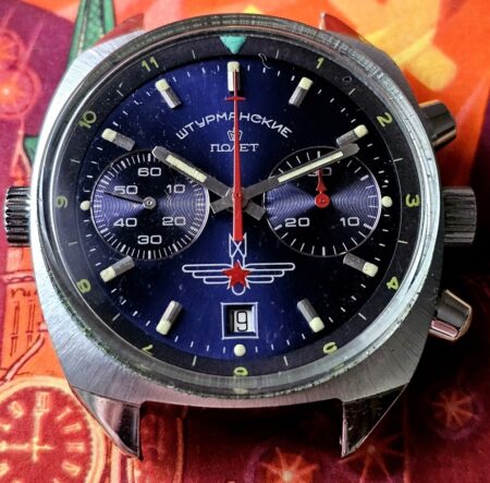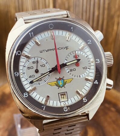 Le logo sur les chronographes Stourmanskie correspond à l’insigne de navigateur de première classe, le 1 figurant au centre du bouclier étant toutefois retiré du logo. Poljot a donc actualisé le logo des Stourmanskie au regard de l’évolution de l’insigne militaire décerné aux navigateurs.