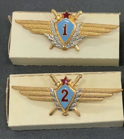 Ci-dessous les insignes de poitrine des navigateurs de 1re, 2e et 3e classe, introduits par l’Ordre du ministère de la Défense de l’URSS n° 085 du 8 mai 1950. Ils comportent en leur centre une bombe, attribut réservé aux navigateurs (sans doute une référence au rôle de ces derniers dans les missions de bombardement de la grande guerre patriotique où bien sûr le succès de la mission dépend de la précision de la navigation).
