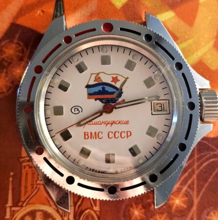 Cadran : blanc avec l’inscription BMC CCCP, военно-морские силы СССР, qui se traduit par forces navales de l’URSS. Présence du drapeau naval de l’URSS en vigueur de 1950 à 1991 et d’un bâtiment de guerre. Au dessous, une feuille de laurier.