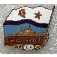 Un insigne reprenant le même motif associant un navire de guerre au pavillon de la flotte: