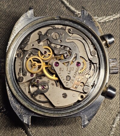 Le mécanisme est gravé SU 3133 mais avec une police qui semble être celle adoptée en 1993. Et un balancier couleur argent (en laiton jusqu’en 1992). Malgré la mention « URSS » du cadran, la production est sans doute post-soviétique.