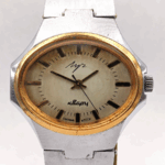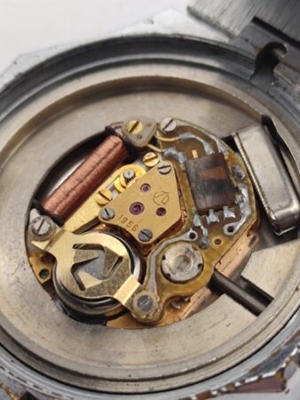 Mécanisme électromécanique à quartz produit dans les années ’80 et ’90. 9 rubis.Le même mécanisme a été produit par Fabrique de Montres de Penza (voir ici) et par la Fabrique de Montres d’Ouglitch (voir ici)