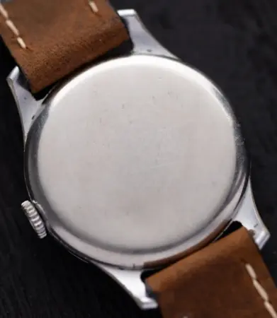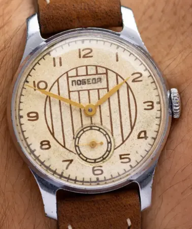 Mentions sur le calibre : n° de série (02366) et 2-54 (2e trimestre 1954) sur un pont, troisième logo de l’usine (initiales 1 ГЧЗ dans un losange) et 15 камней (15 rubis) sur un autre, Победа et trois étoiles sur le rochet. Côtes de Genève.