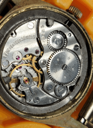 Gravures sur le mécanisme: n° de série (613678) sur un pont, 17 seventeen jewels sur un autre pont, 2605 sur la platine, cinq étoiles sur le rochet.