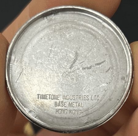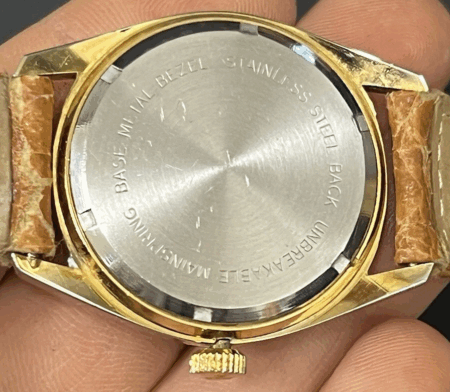 Gravure sur le fond : BASE METAL STEEL, UNBREAKABLE MAINSPRING, STAINLESS STEEL BACK, BASE METAL BEZEL en cercle, à l’extérieur, et TIMETONE INDUSTRIES LTD HONG KONG à l’intérieur
