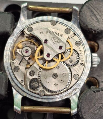 Mentions sur le calibre : n° de série (171780) et 3-55 (3e trimestre 1955) sur un pont, logo de l’usine (initiales 1MЧЗ dans un losange) et 16 камней (16 rubis) sur un autre, ГC1MЧЗ et trois étoiles sur le rochet. Côtes de Genève.