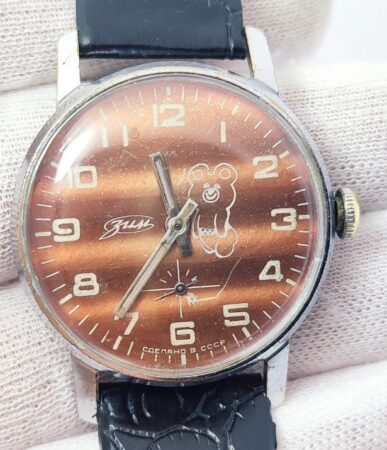 Montre bracelet de la Fabrique Maslenikov avec l’ourson Michka, mascotte des jeux olympiques de 19880 à Moscou (pour en savoir plus sur ce motif).