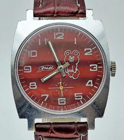 Montre bracelet de la Fabrique Maslenikov avec l’ourson Michka, mascotte des jeux olympiques de 19880 à Moscou (pour en savoir plus sur ce motif).