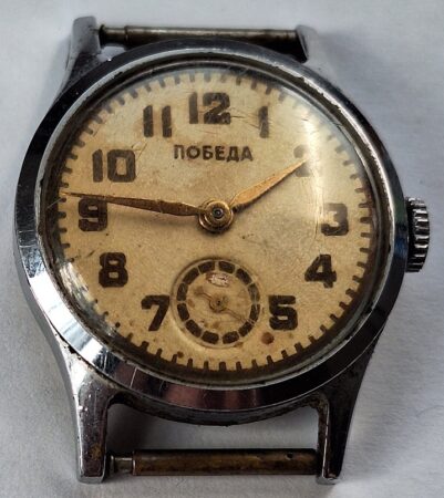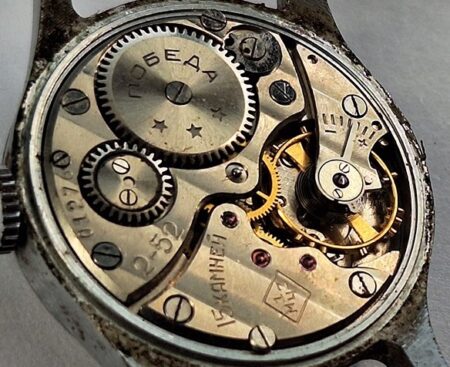 Gravure sur le mécanisme : N° de série (01276) et 2-52 (2e trimestre 1952) sur un pont, troisième logo de l’usine (initiales dans un losange) sur un pont et 15 камней (15 rubis) sur un autre, Победа et trois étoiles sur le rochet. Côtes de Genève.