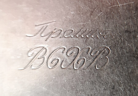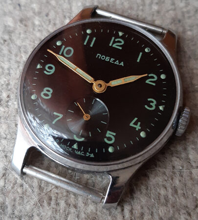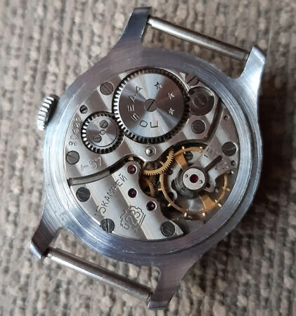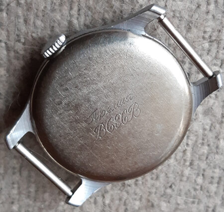 Le dos porte le poinçon « Prix VSKhV » (« Премия ВСХВ ») sur le boîtier (voir ici les montres de l’Exposition agricole de l’union VSKhV)