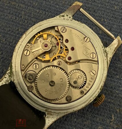 Mentions sur le calibre : 15 камней et logo de la fabrique (les initiales ПЧЗ inscrites dans un losange) sur un pont, trois étoiles et Pobeda sur le rochet, côtes de Genève.