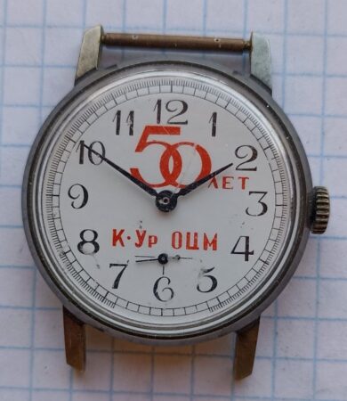 Montre commémorative des 50 ans de la fondation officielle, le 15 février 1942, de la Fabrique de traitement des métaux non ferreux de Kamensk-Oural. (Каменск-Уральский завод по обработке цветных металлов, K.Ur OTsM ou plus communément KUZOTsM).
