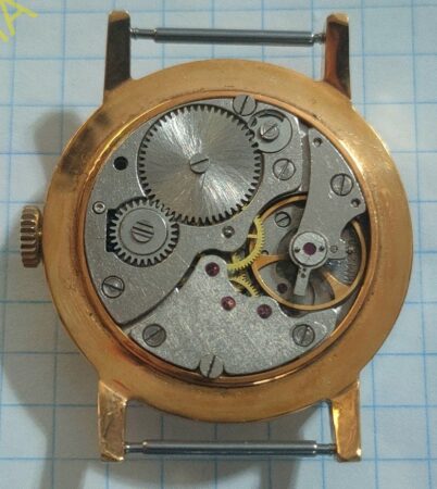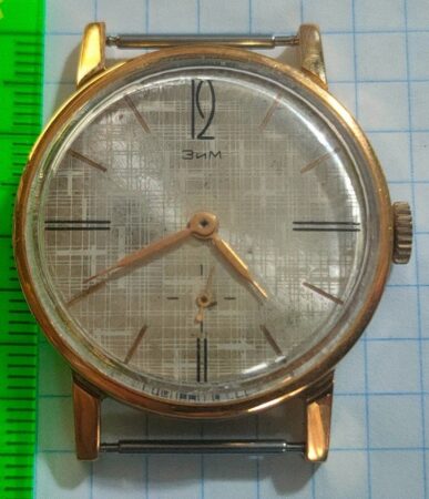 Mentions sur le calibre : ЗИМ et 15 камня (15 rubis) sur un pont, n° de série (504724) sur un autre, 2602 sur la platine. Côtes de Genève