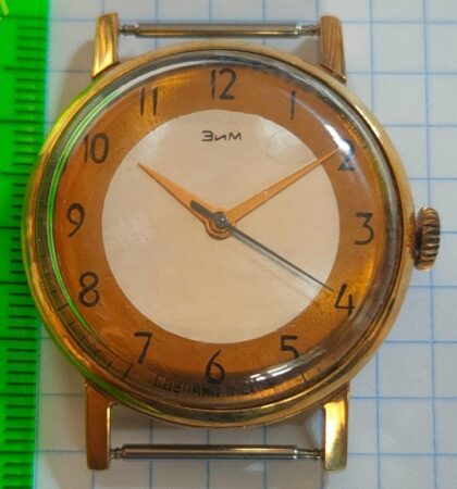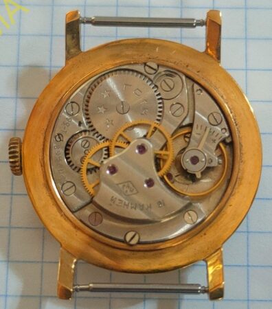 Le mécanisme de cet exemplaire a été produit le 1er trimestre 1956 par la 1ère Fabrique de Montres de Moscou Kirov – il ne s’agit donc pas du mécanisme d’origine
