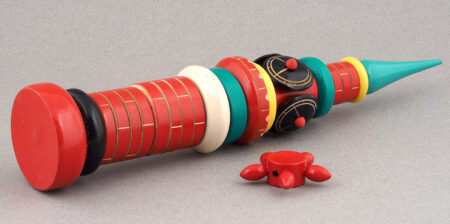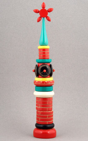 Tour à l’horloge en bois peint à éléments empilables sur un axe évoquant la tour Spasskaya du Kremlin, jouet pour enfant de 5 à 7 ans.