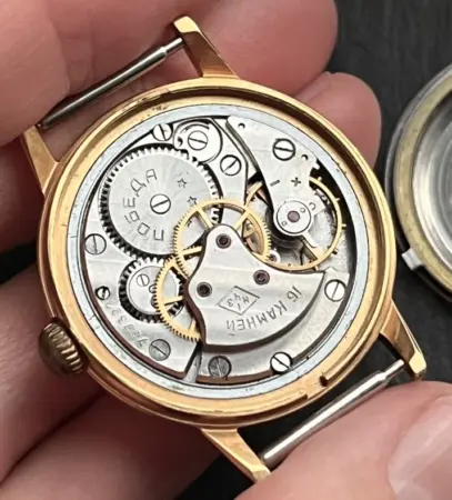 Gravure sur le mécanisme : N° de série (727322) sur un pont, troisième logo de la 1FMM (initiales dans un losange) sur un pont et 16 камней (16 rubis) sur un autre, Победа et trois étoiles sur le rochet. Côtes de Genève.
