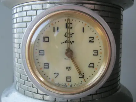 Le réveil est un Mir 17B/8 modèle B-11 K/8 à mécanisme 61M à 11 rubis de la 2e Fabrique de montres de Moscou, datant de 1962.