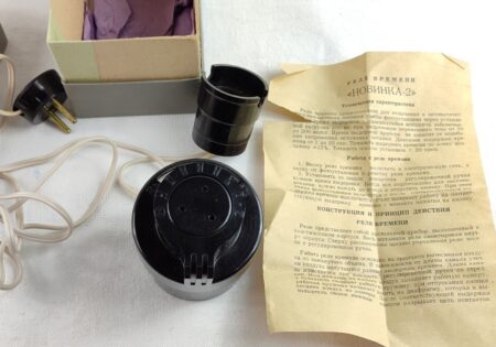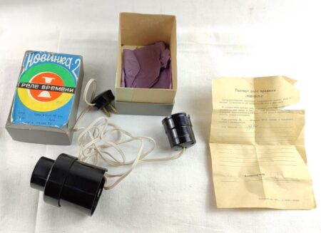 Minuteur soviétique destiné aux agrandisseurs photographiques, fabriqué en Union soviétique dans la seconde moitié du XXᵉ siècle. Ce type d’appareil était largement utilisé dans les laboratoires de photographie argentique, notamment dans les clubs photographiques et les chambres noires domestiques, afin de contrôler avec précision la durée d’exposition du papier photographique.