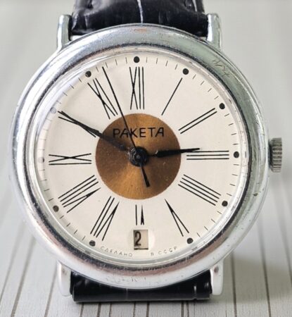 Mentions sur le calibre : 2614.H et SU (Soviet Union) sur le pont, logo raketa (raquette symbolisée) sur la platine.