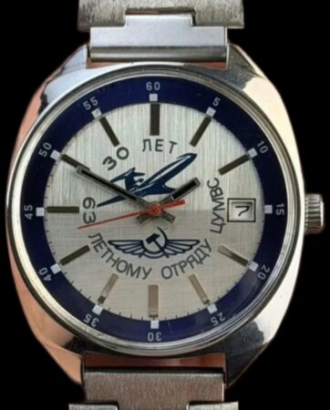 Cette montre commémoratif les 30 ans du 63e détachement de vol du ЦУМВС (30 лет 63 летному отряду ЦУМВС). Le ЦУМВС, c’est la Центральное управление международных воздушных сообщений, l’Administration centrale des liaisons aériennes internationales. Ce détachement de l’Aeroflot, basé à l’aéroport de Moscou-Sheremetyevo, a été créé en 1952. La montre date donc de 1982. Sur le cadran figurent le logo de la compagnie aérienne et le dessin stylisé d’un avion triréacteur, opéré par ce détachement : le Tupolev Tu-154.