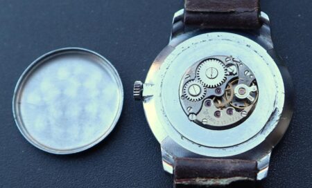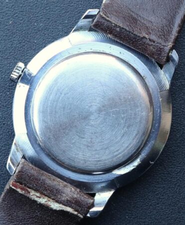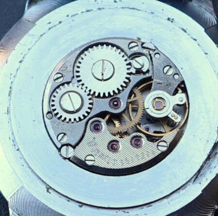 Mentions sur le calibre : 1601A et dernier logo Tchaïka (T dans un écu) sur un pont, 17 jewels et n° de série sur un autre. Striures en guise de Côtes de Genève