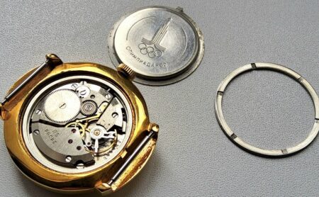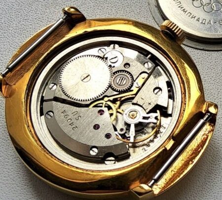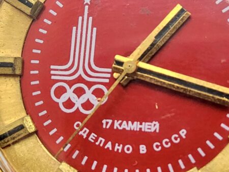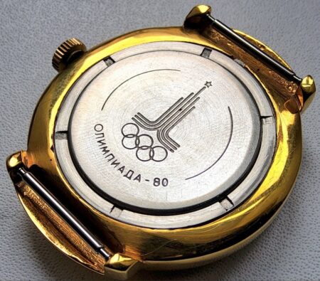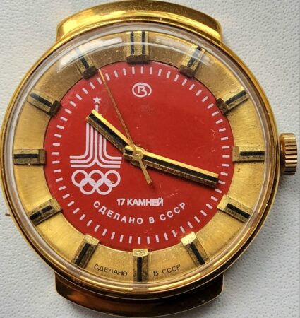 Montre bracelet, mécanique, de la Fabrique de Montre de Tchistopol célébrant les Jeux olympiques de Moscou de 1980 avec le logo des Jeux.
