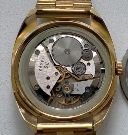 Mentions sur le calibre : 2409A et SU (Soviet Union) sur le pont, n° de série et logo Vostok (B dans un cercle) sur la platine.
